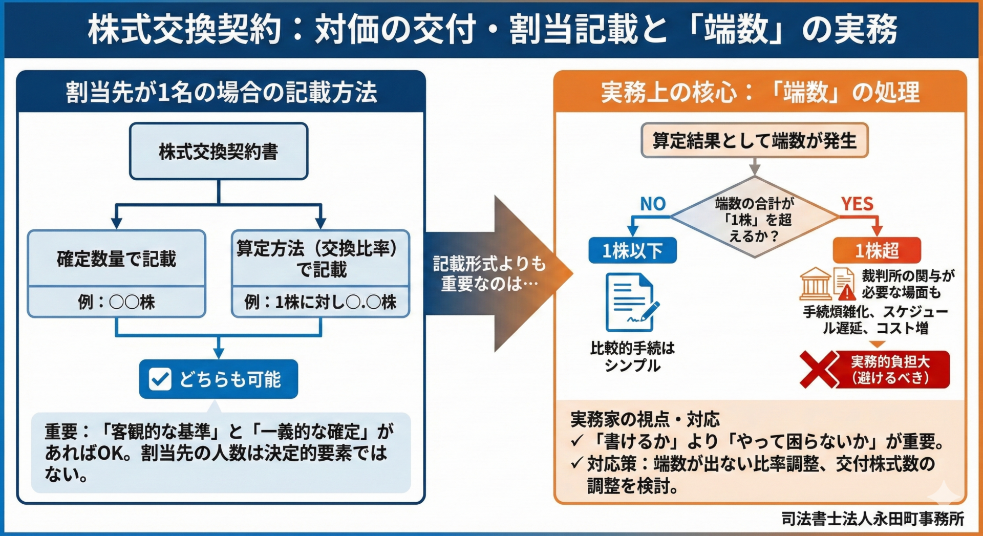 割当先が1名であっても、交換比率を用いた算定方法で契約書を構成すること自体は可能です。