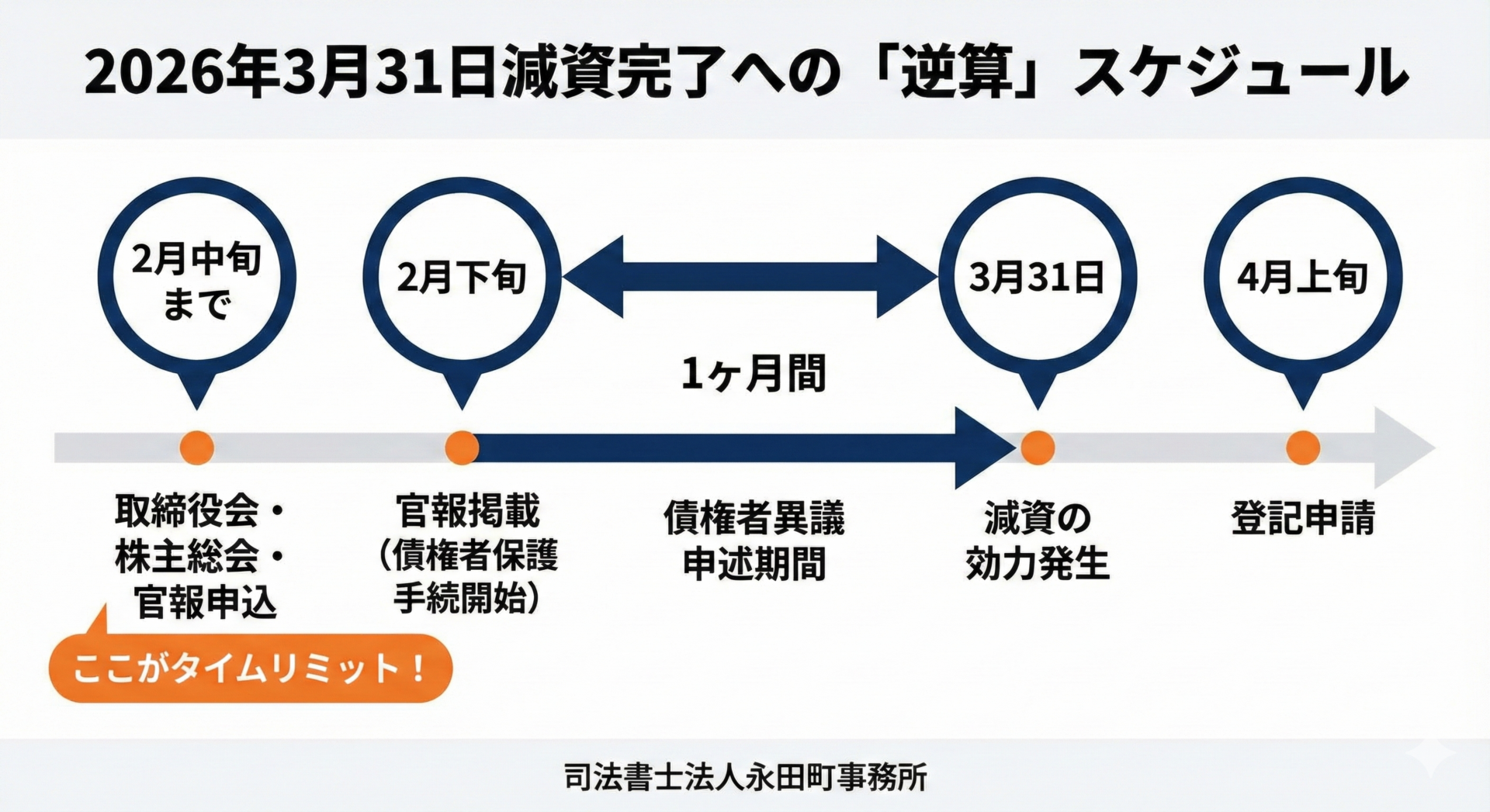 本日は、2026年3月31日までに減資したい場合の「逆算スケジュール」をご紹介しました。