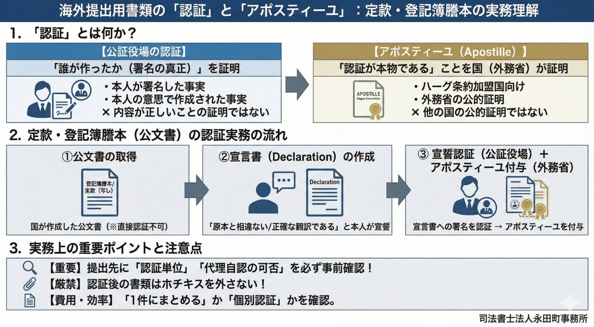 外国向け文書の「認証」と「アポスティーユ」の意味を、実務目線で整理します。