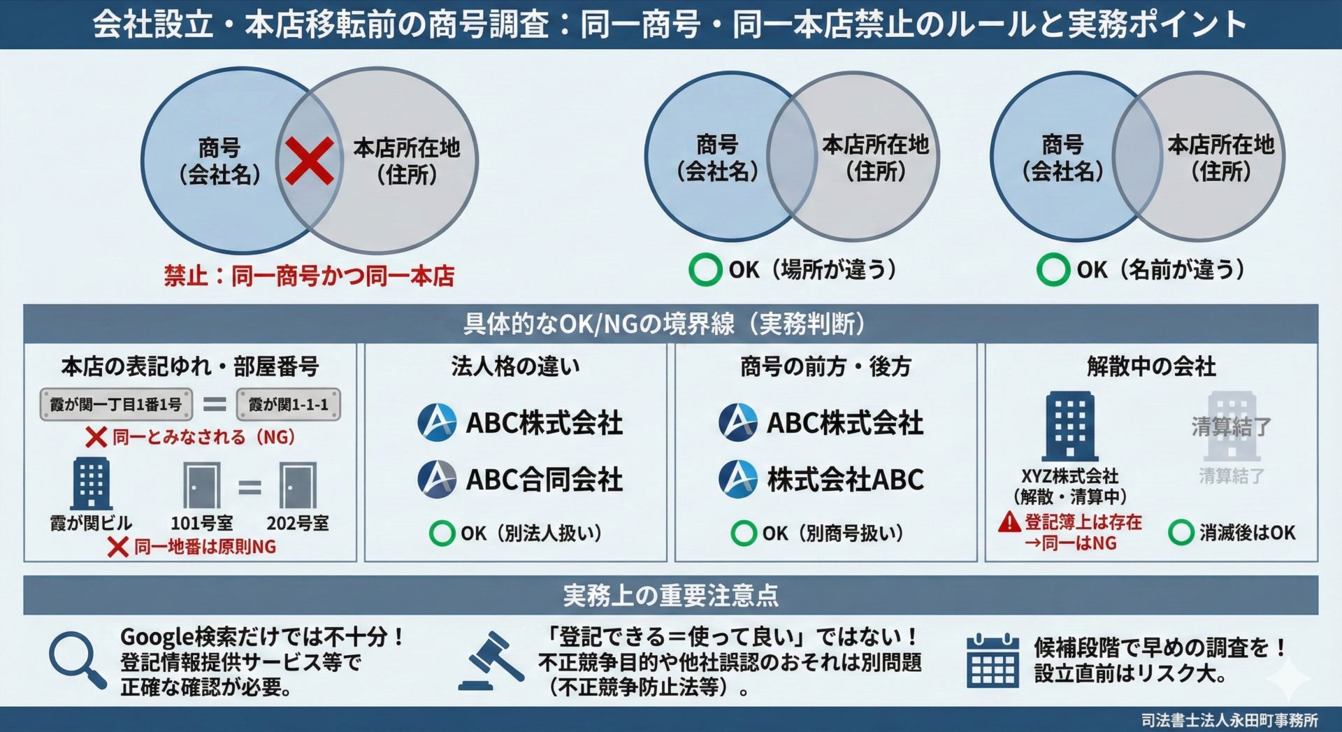 同一商号・同一本店の禁止は、「名前が似ているかどうか」ではなく、登記上、同一の会社が存在するかどうかという極めて実務的なルールです。