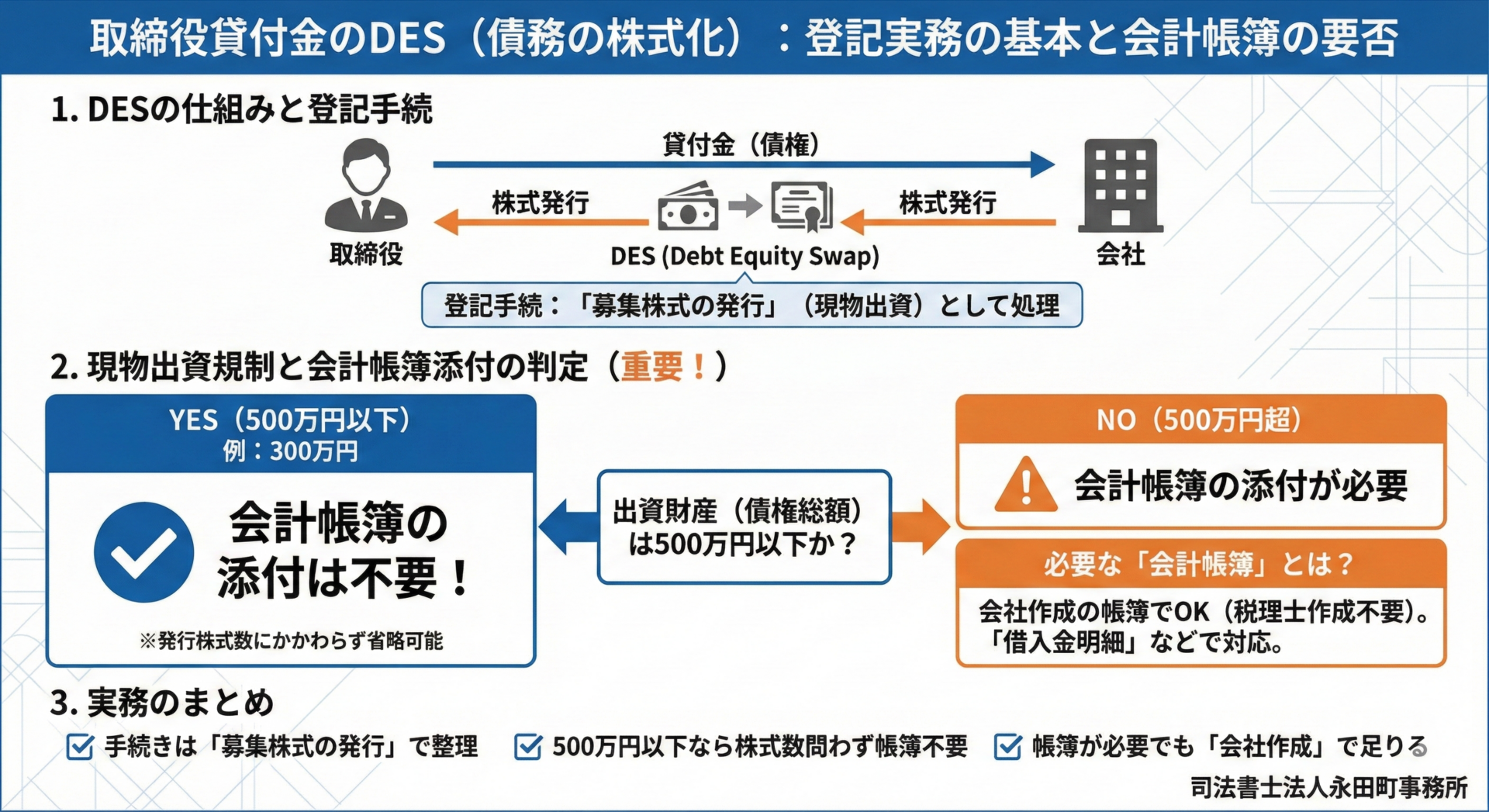 本稿では、取締役の貸付金300万円を株式に振り替えるケースを想定し、DESの登記実務を整理します。