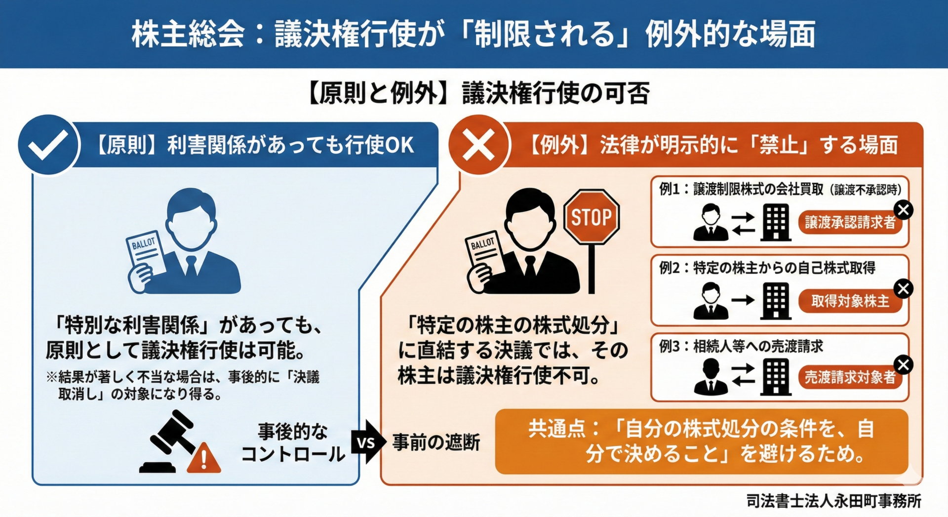 そのため、議決権行使が制限される場面は、法律で明確に定められた例外に限られます。