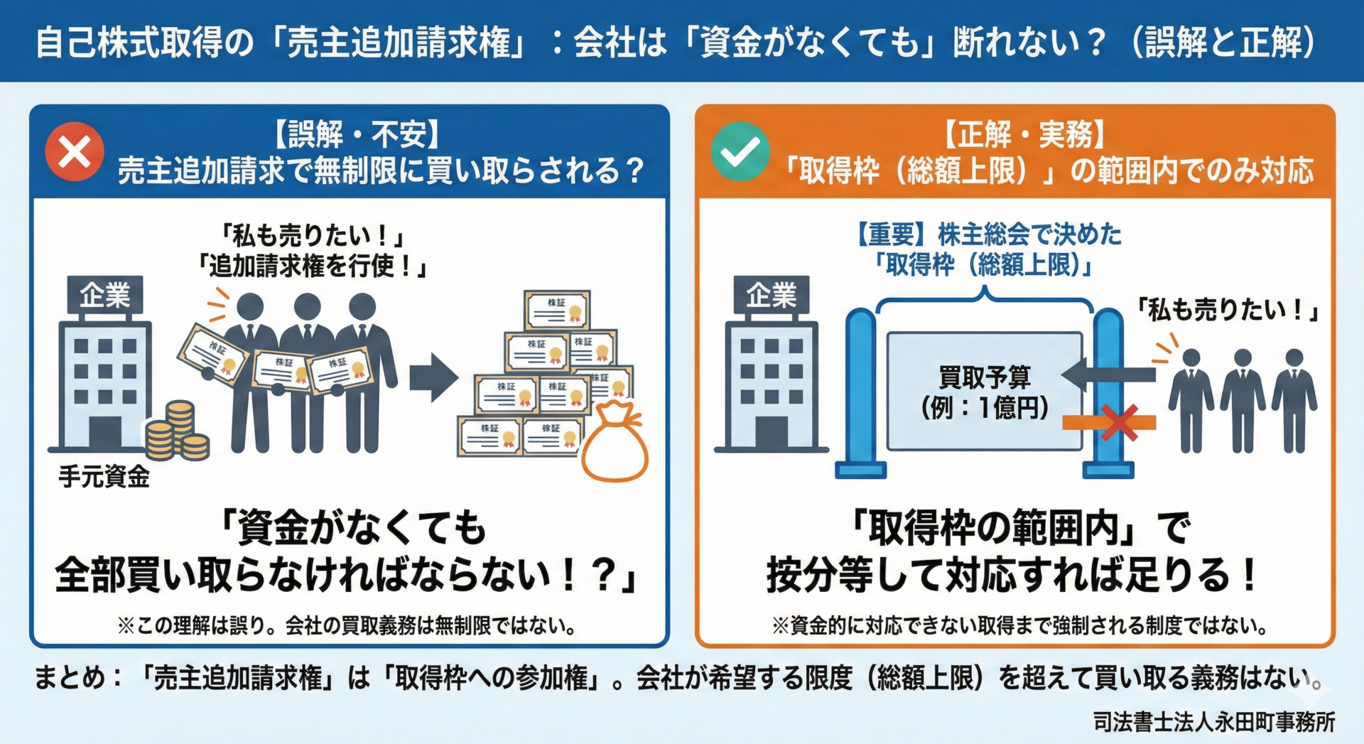 売主追加請求権が行使されたとしても、会社は、株主総会で決議した取得枠の範囲で対応すれば足りるのであり、資金的に対応できない取得まで強制される制度ではありません。