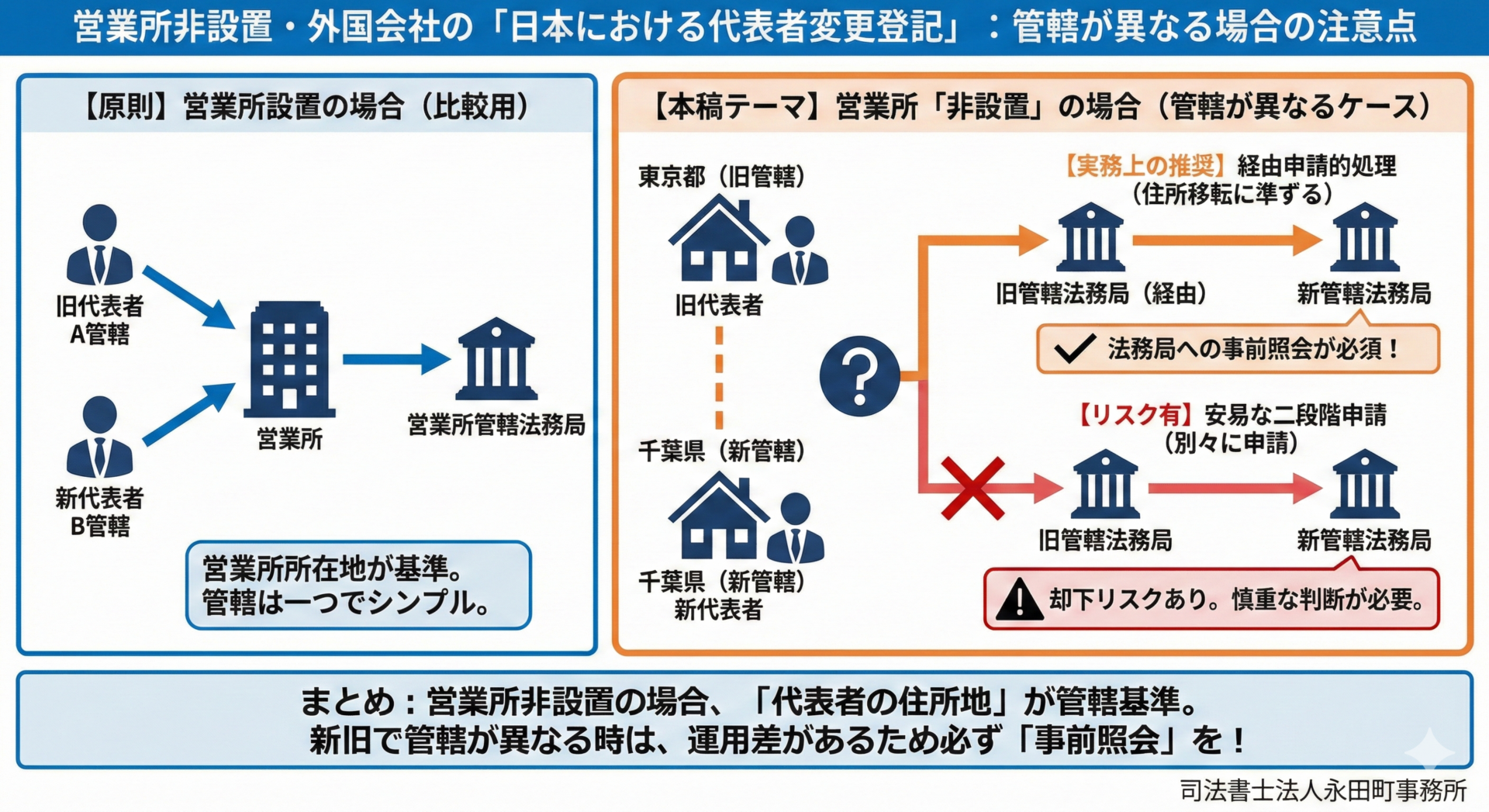 本日は、営業所を設置していない外国会社の「日本における代表者変更登記」管轄が分かれる場合の考え方と注意点について解説しました。