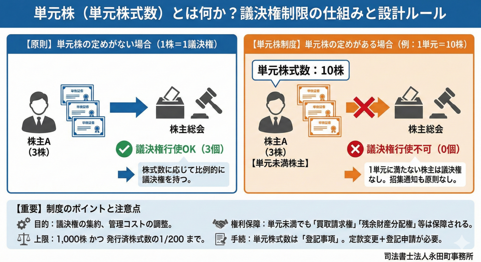 本日は、単元株とは何か?議決権制限の仕組みと、実務で押さえるべき設計ルールについて解説しました。