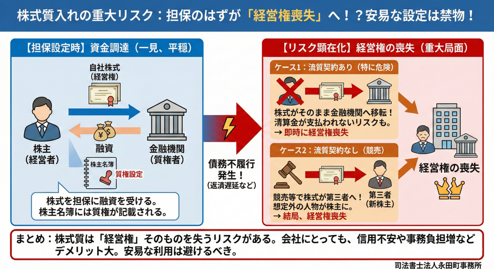 が質入れされる場合には、会社の存続・支配構造そのものが左右される可能性があります。