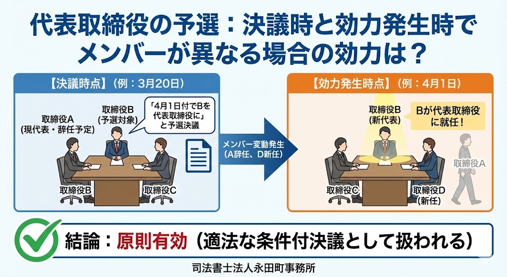 特に問題となるのは、予選決議時点の取締役会構成と効力発生時点の取締役会構成が異なる場合に、就任の効力が認められるのかという点です。
