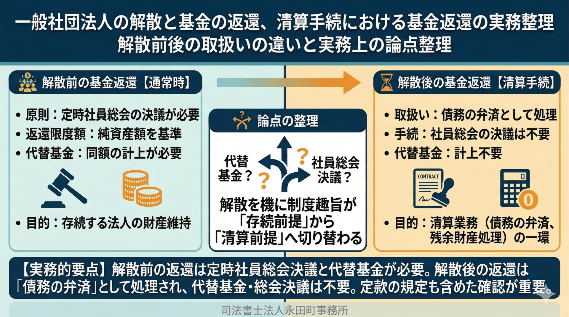 つまり、通常時の「基金返還」とは法的性質が異なり、清算手続の中で行われる支払という位置付けになります。