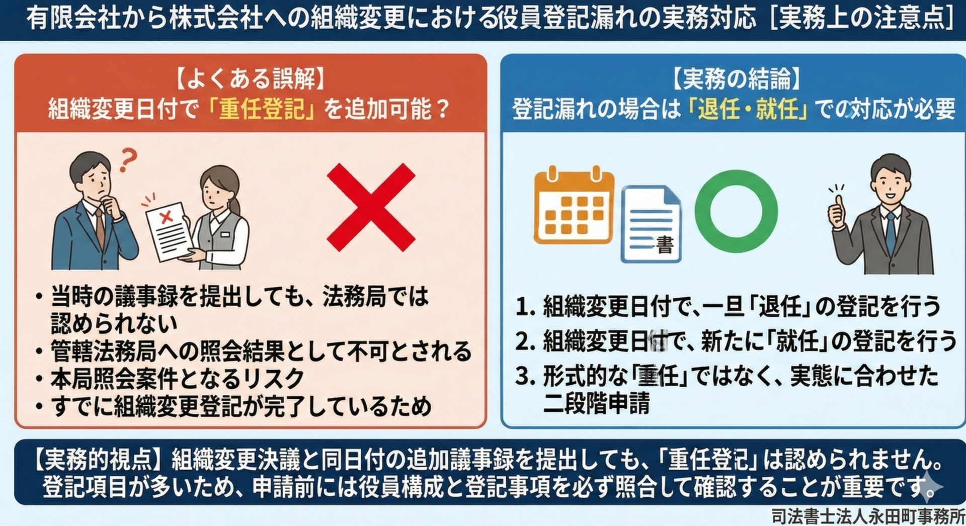 有限会社から株式会社への組織変更後に、役員登記の漏れに気付いた場合、組織変更日付で重任登記を追加することはできないという整理になります。