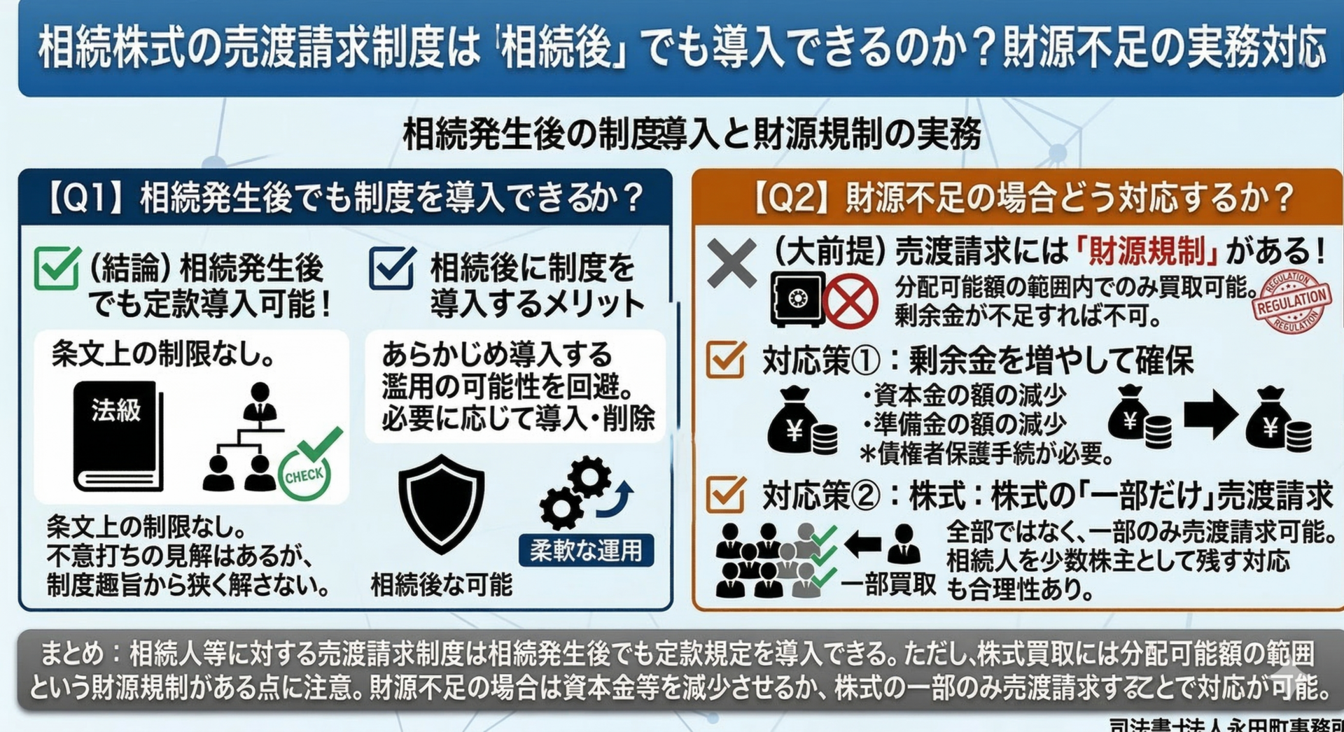 相続株式の売渡請求制度は「相続後」でも導入できるのか?財源不足の場合の実務対応も含めて解説