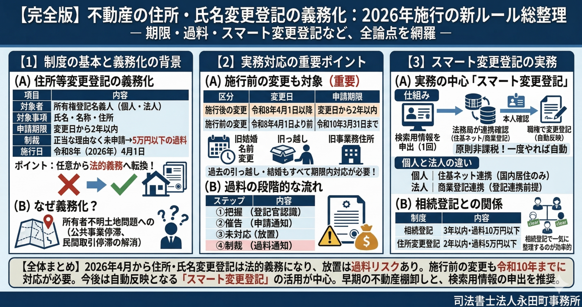 【完全版】不動産の住所変更登記・氏名変更登記の義務化、2026年施行の新ルールを網羅的に整理(期限・過料・スマート変更登記など)