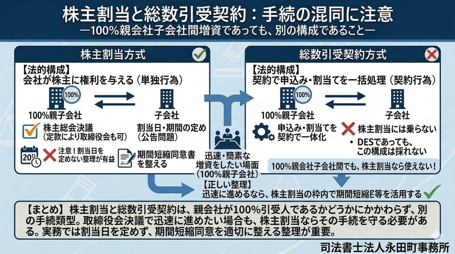 したがって、契約方式である総数引受契約を、そのまま株主割当の枠内に持ち込むことはできない、という整理になります。